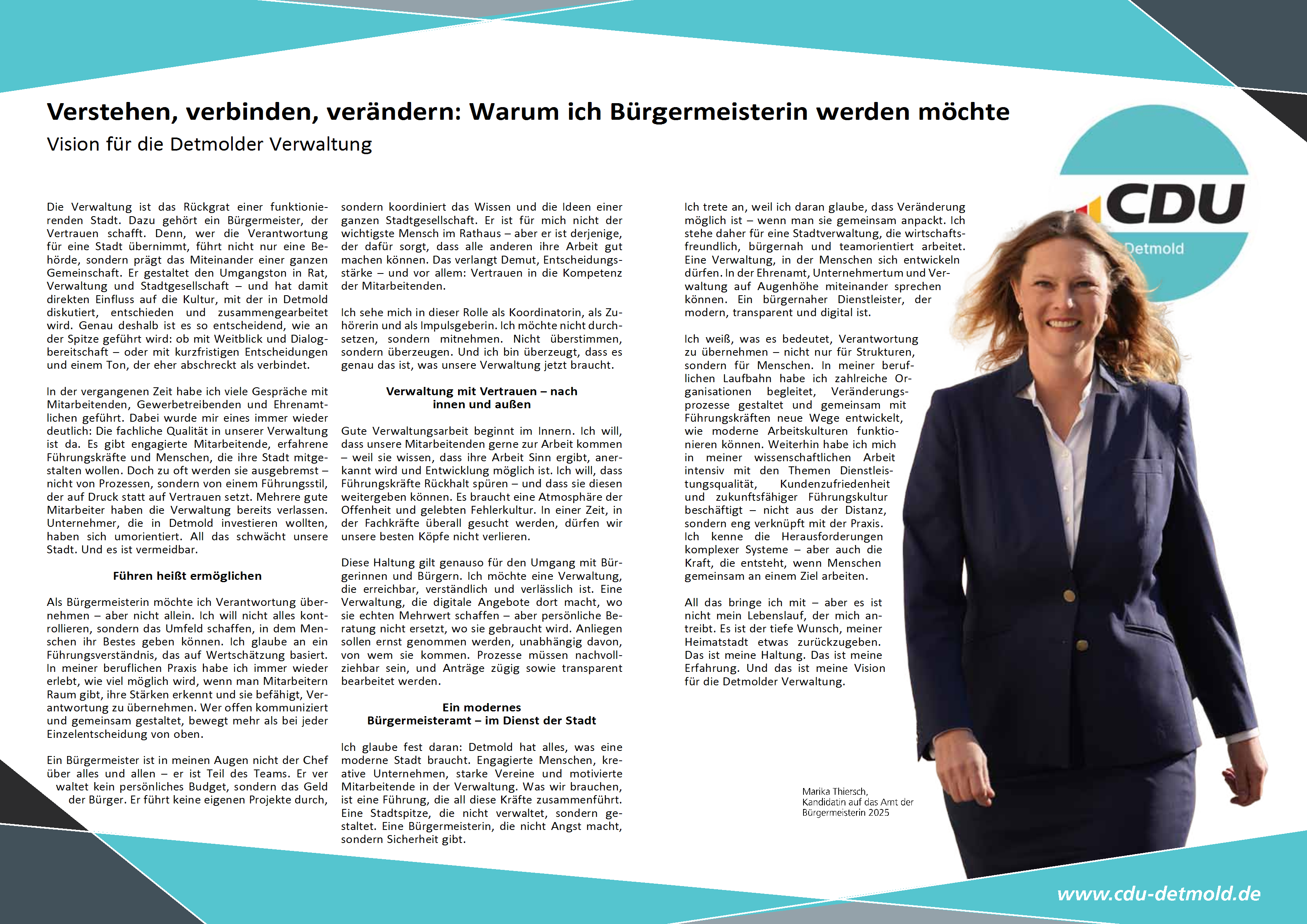 Ich biete klare Visionen und setze mich konsequent für Fortschritt ein. Detmold braucht eine starke Hand, um Herausforderungen wie den Wohnungsmarkt oder die Innenstadtentwicklung zu meistern – und ich bin bereit, Verantwortung zu übernehmen.